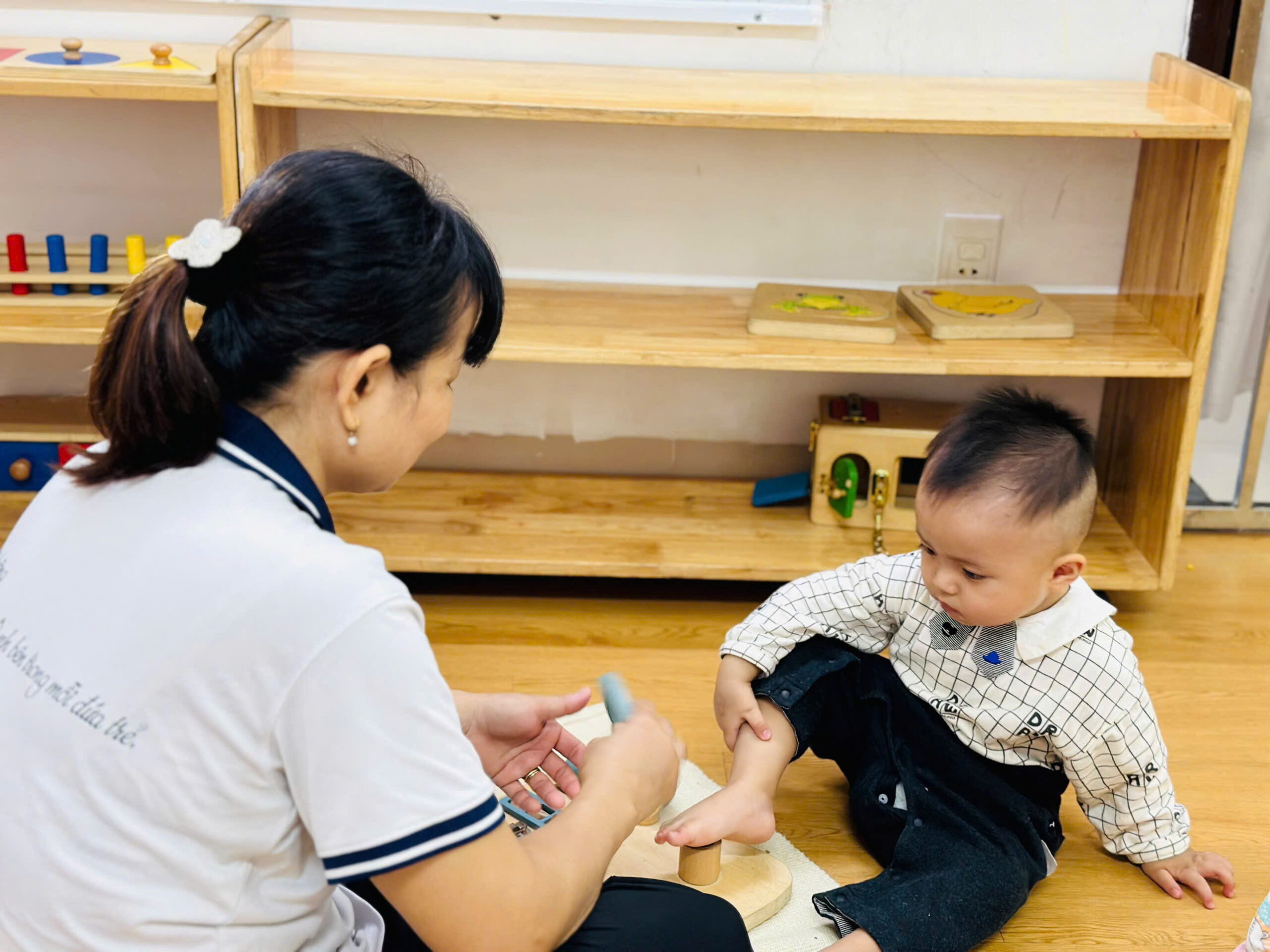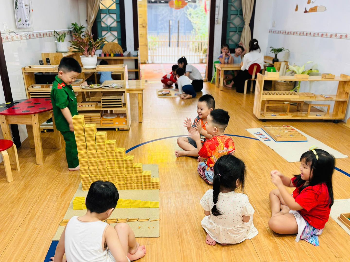 Thiết kế vừa tầm mắt: Mọi giáo cụ, kệ tủ đều thấp vừa tầm với của trẻ, giúp bé tự do lựa chọn hoạt động mà không cần sự can thiệp liên tục của người lớn.