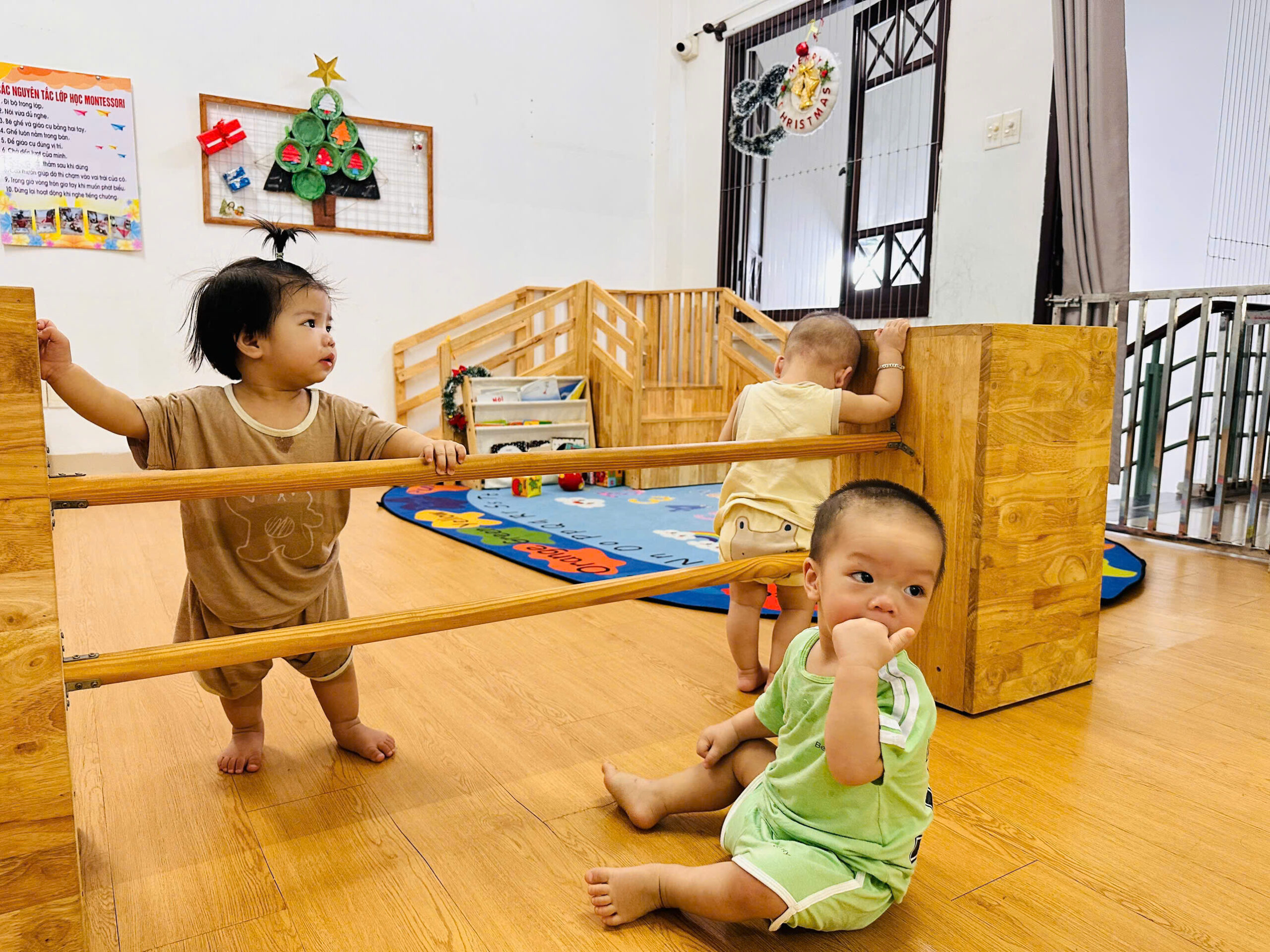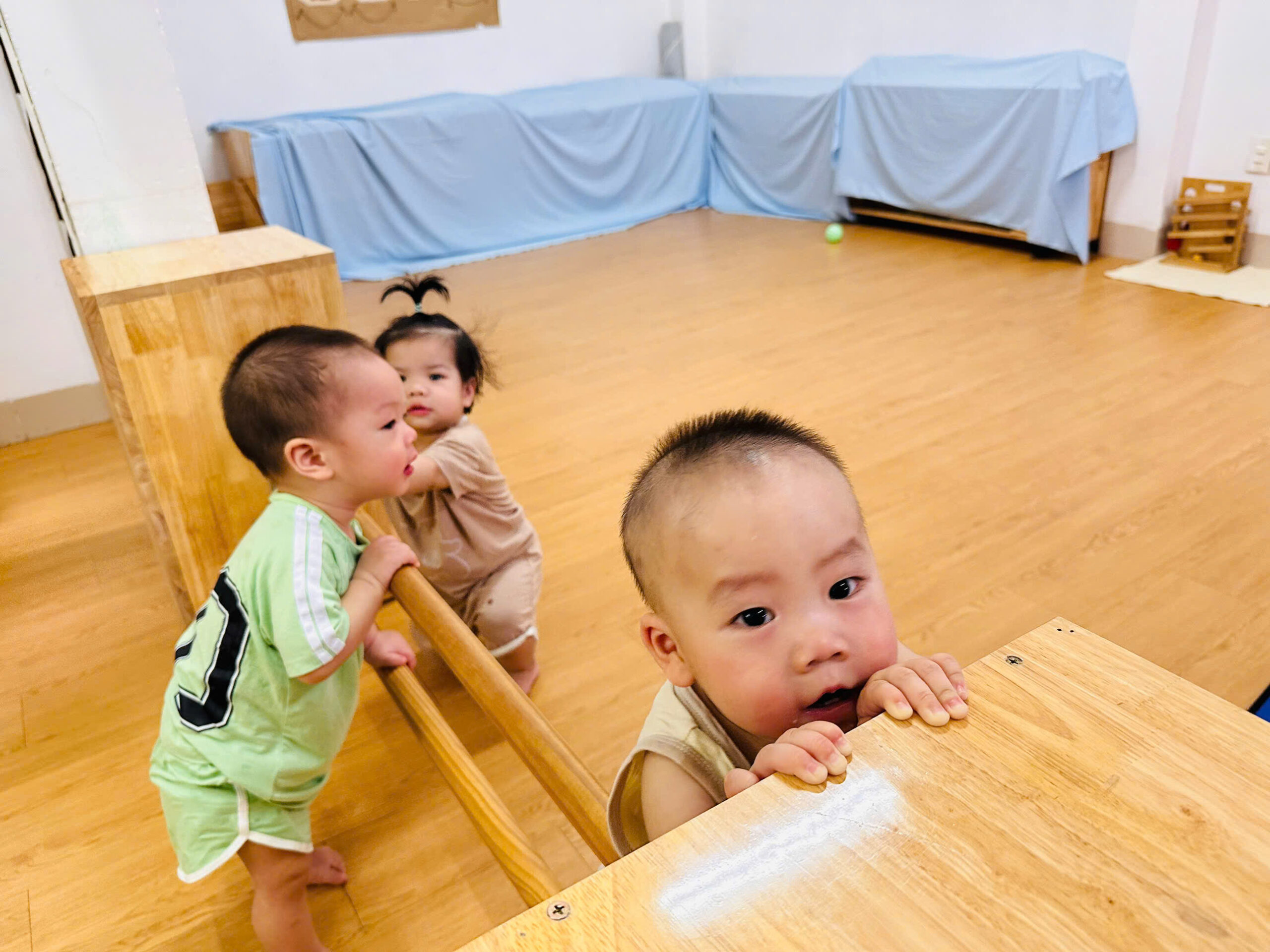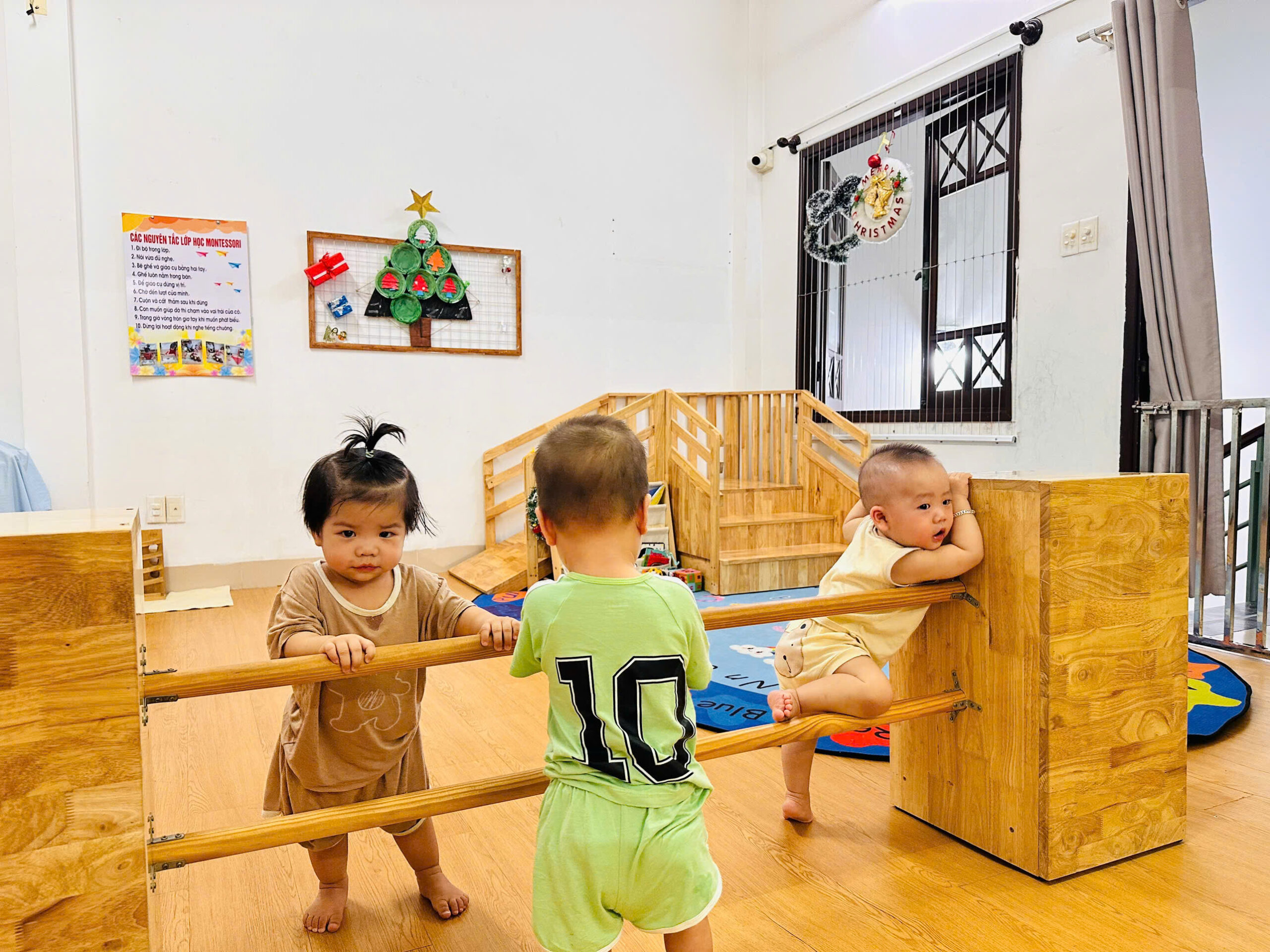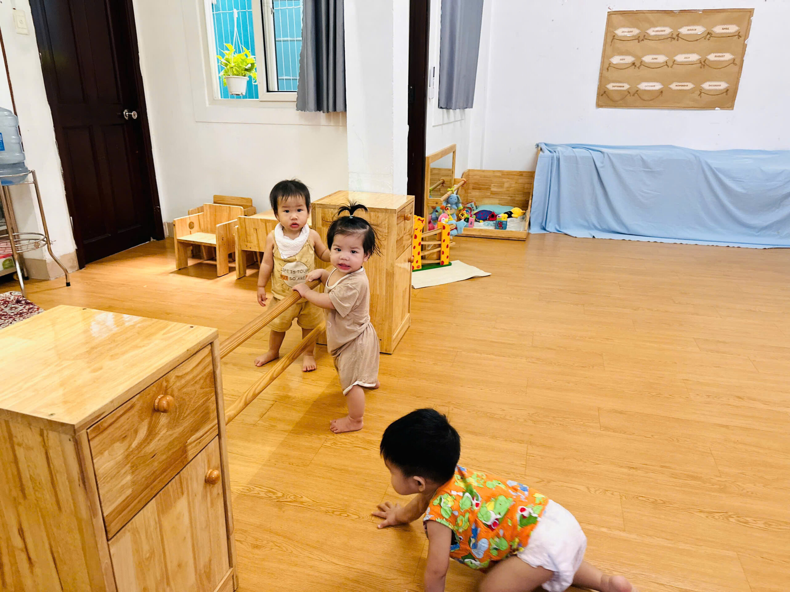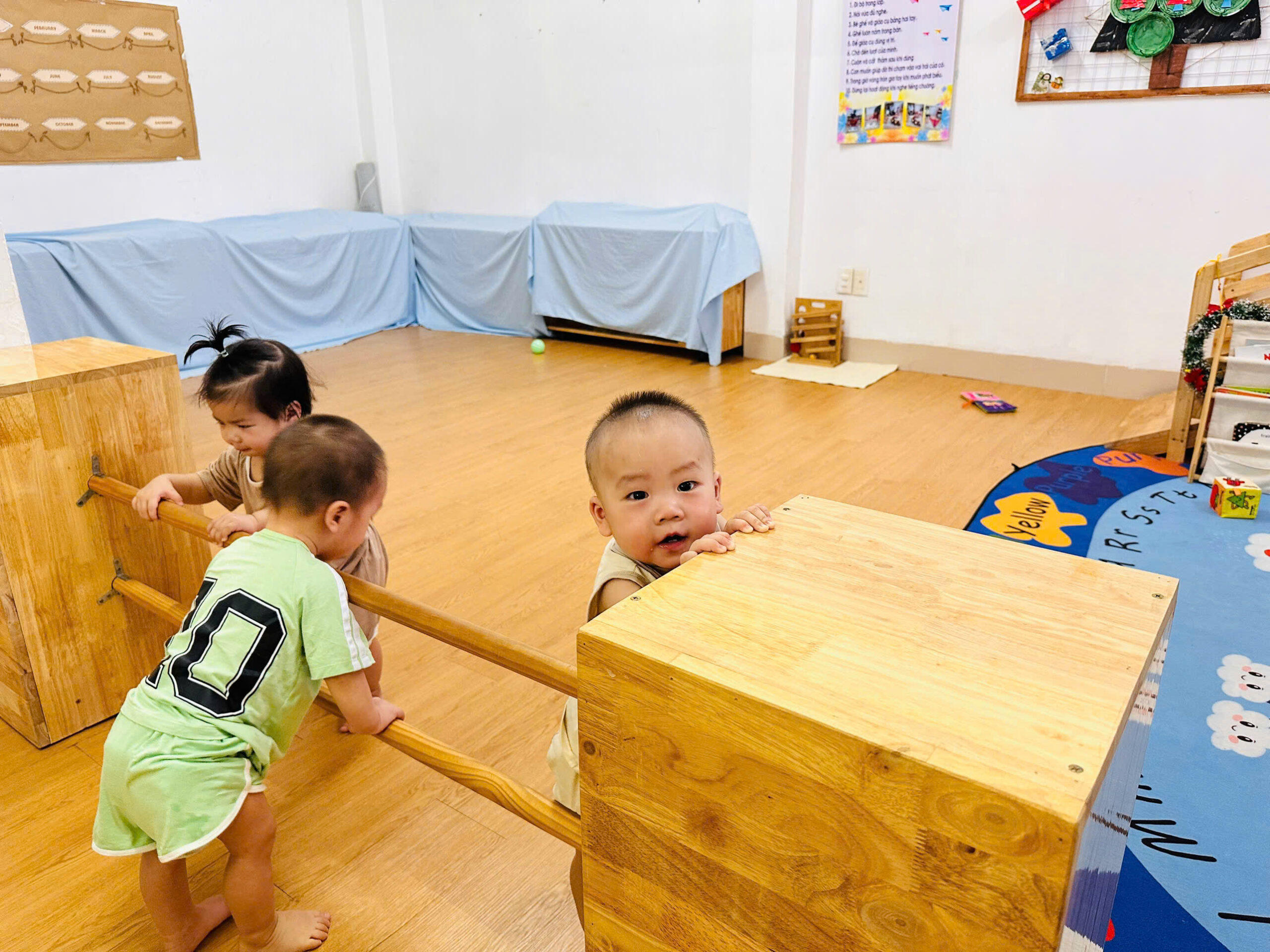 Khu vực vận động chuyên biệt: Có thanh vịn tập đi, bục leo trèo nhỏ và không gian rộng rãi để bé tập lẫy, bò, trườn và bước đi những bước đầu tiên vững chãi.