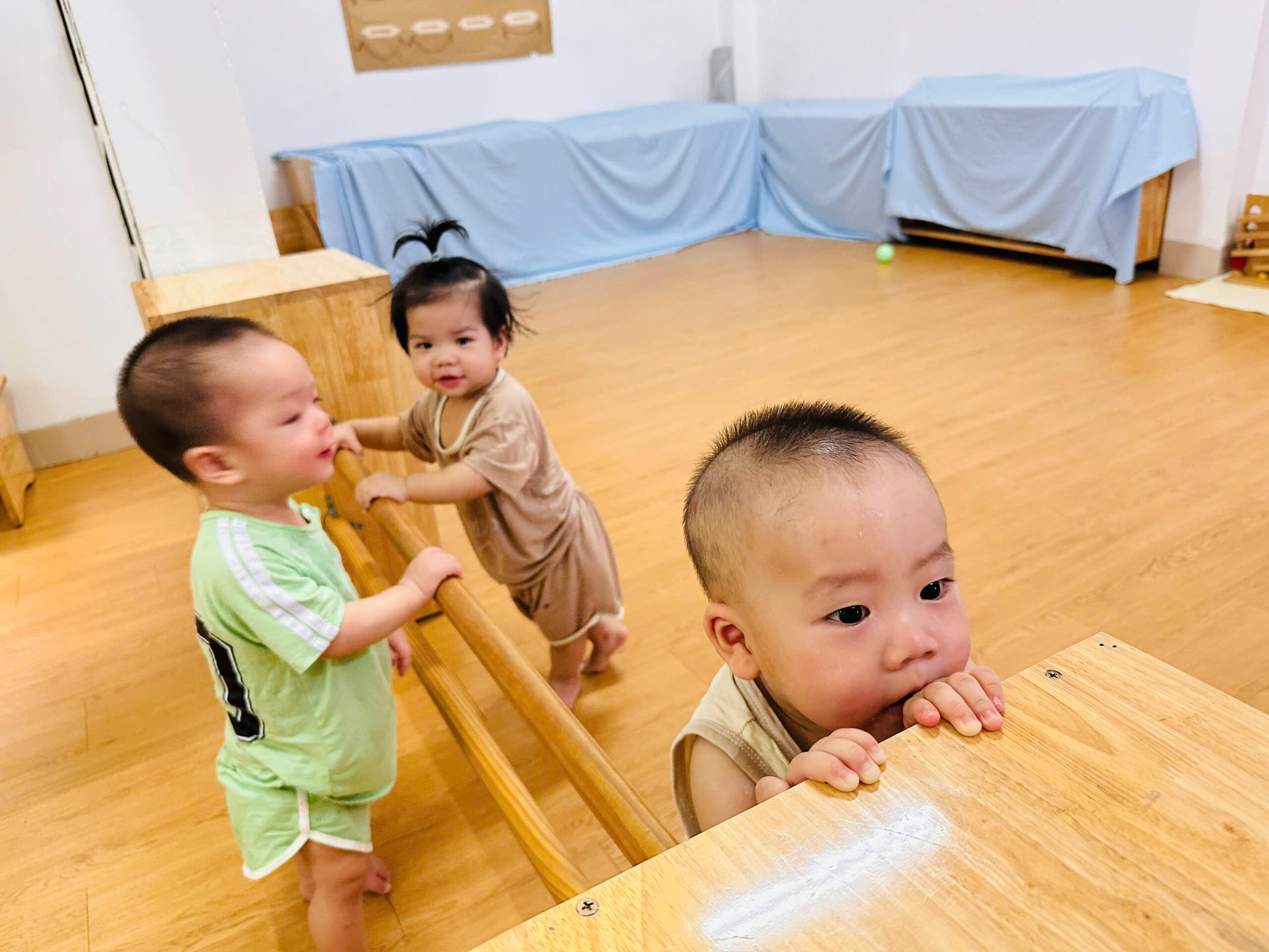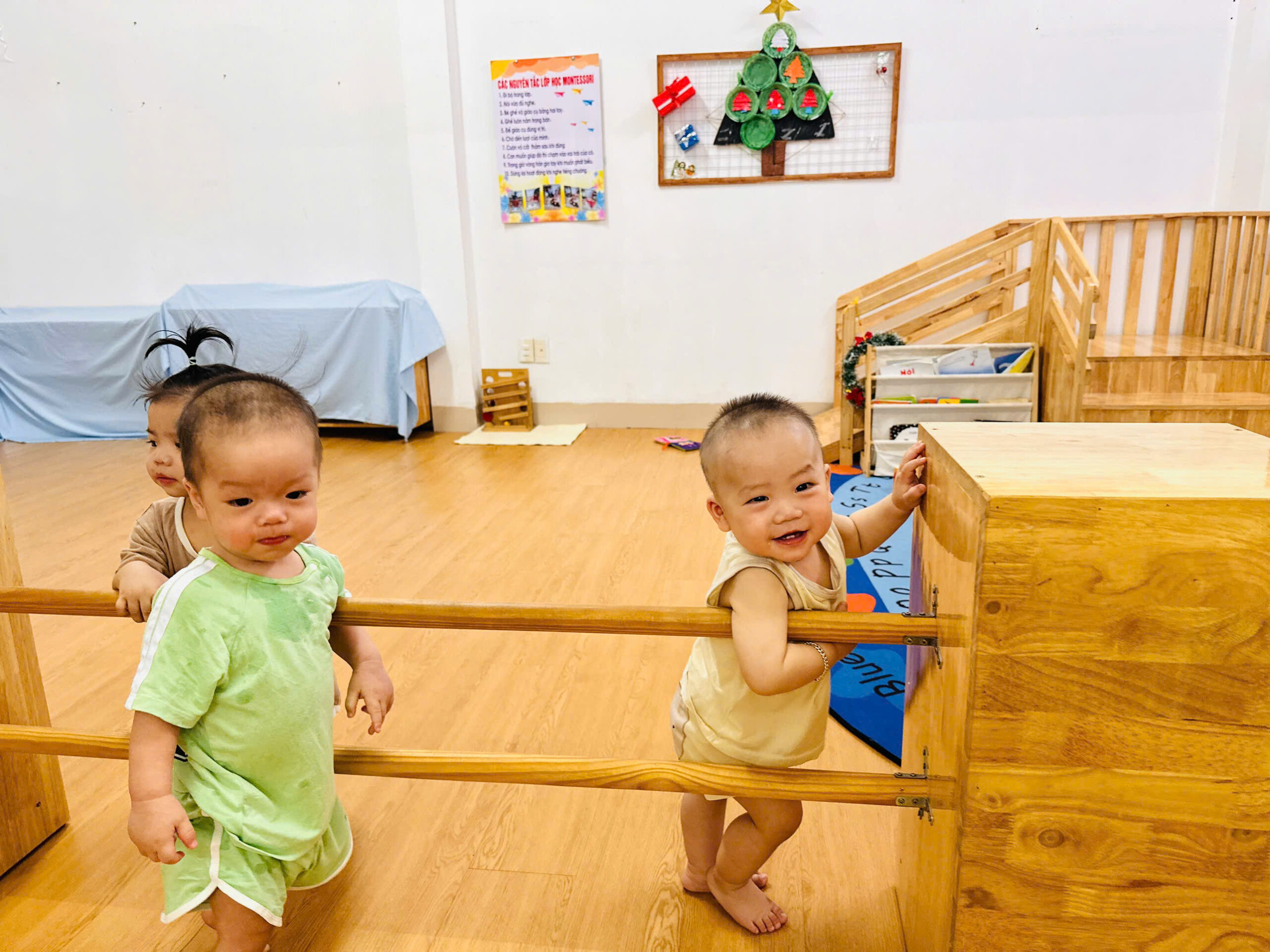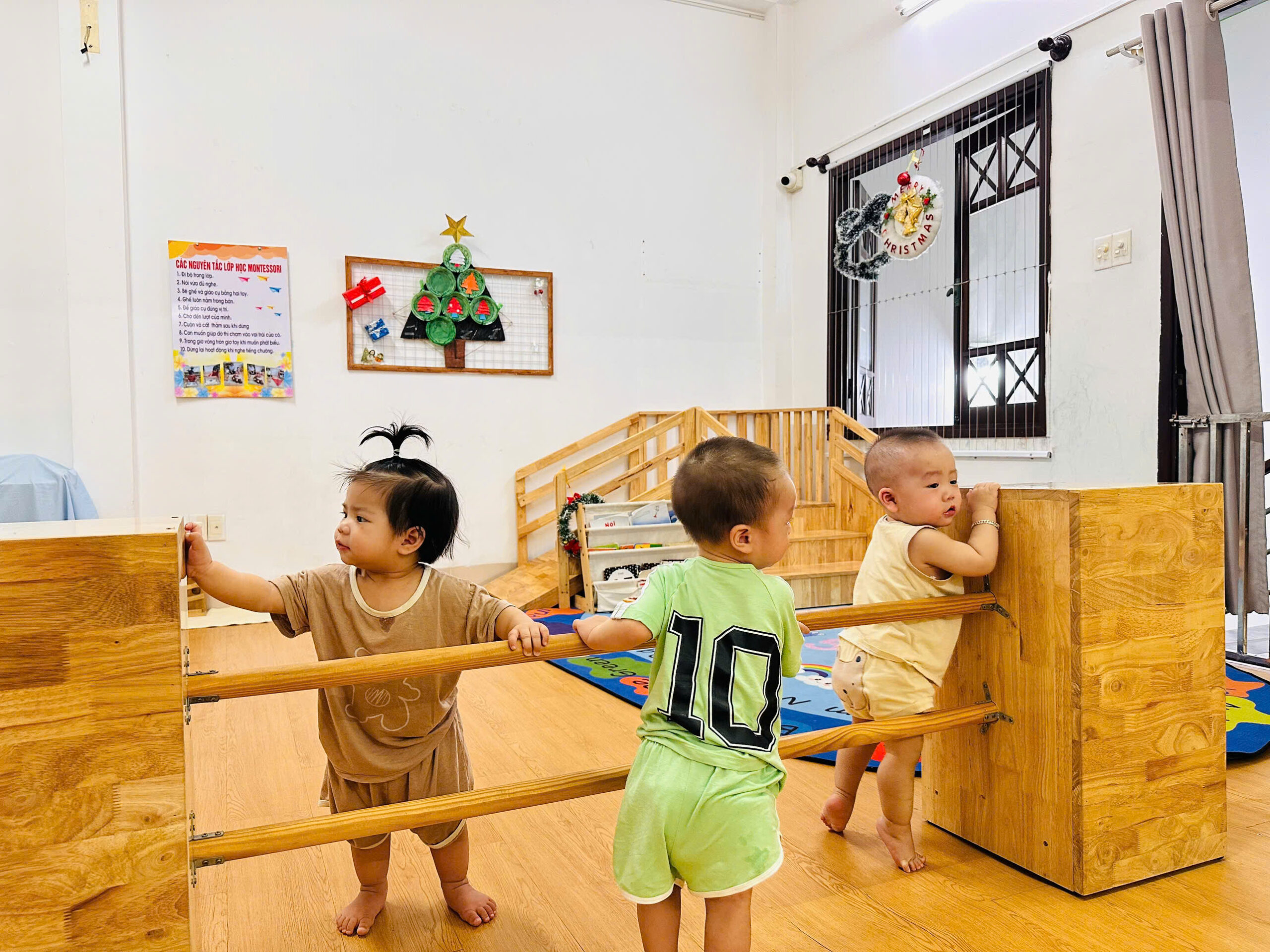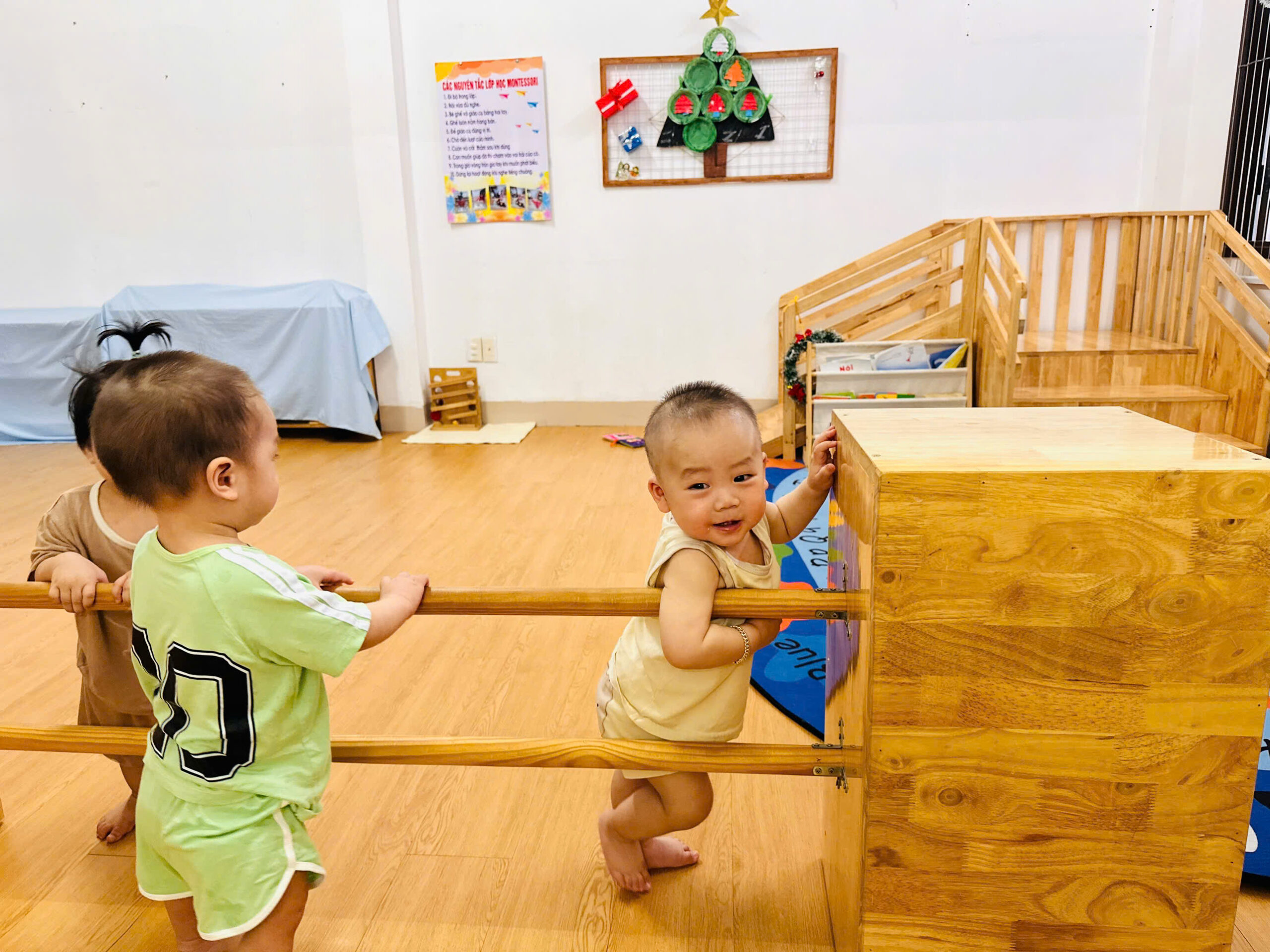 Khu vực vận động chuyên biệt: Có thanh vịn tập đi, bục leo trèo nhỏ và không gian rộng rãi để bé tập lẫy, bò, trườn và bước đi những bước đầu tiên vững chãi.