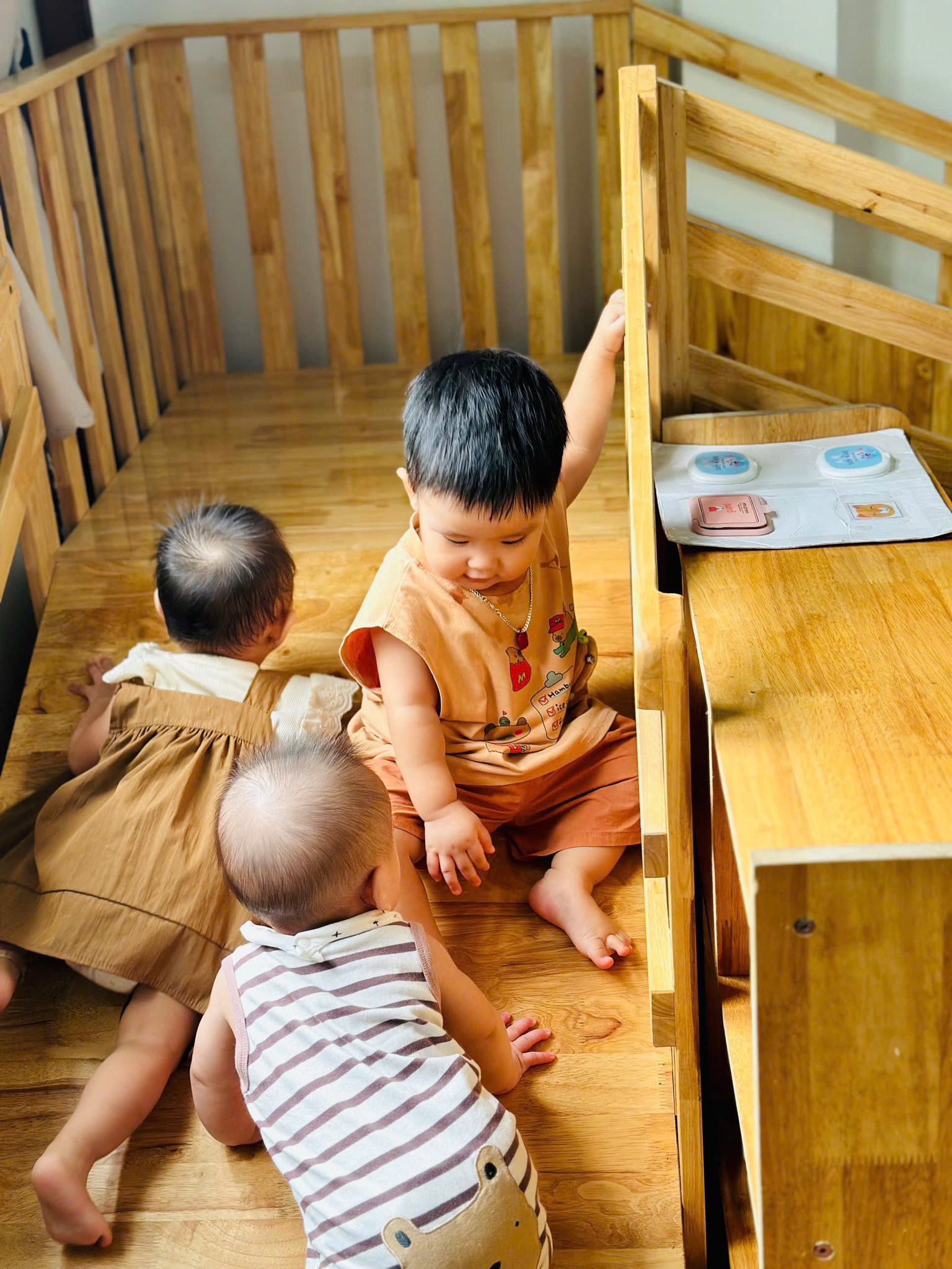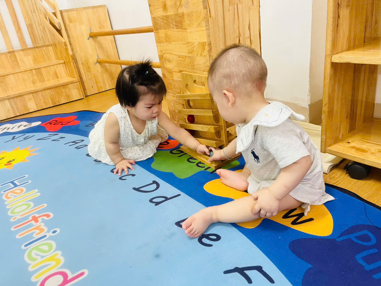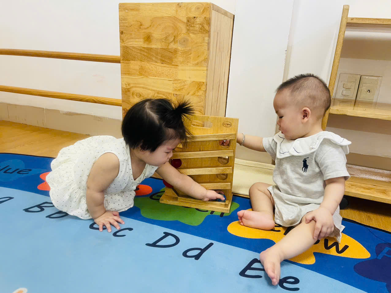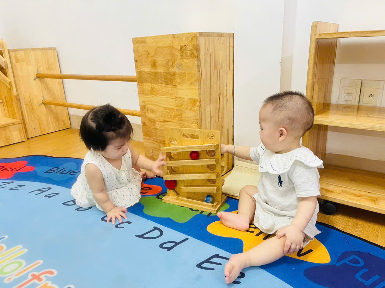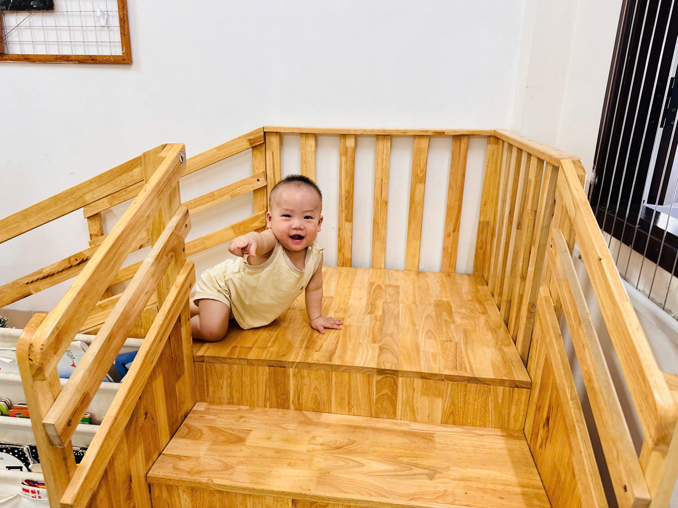 Khu vực vận động chuyên biệt: Có thanh vịn tập đi, bục leo trèo nhỏ và không gian rộng rãi để bé tập lẫy, bò, trườn và bước đi những bước đầu tiên vững chãi.