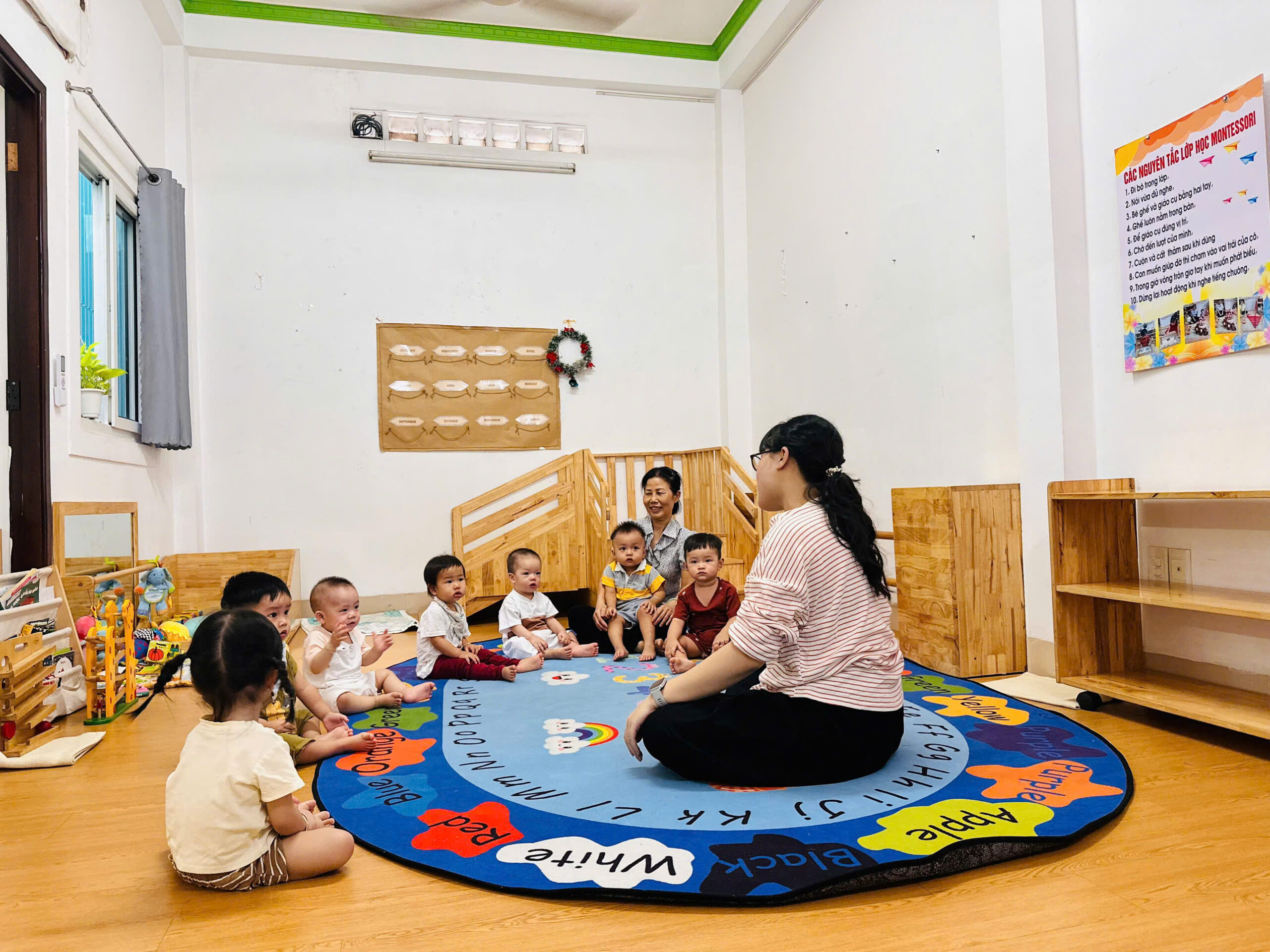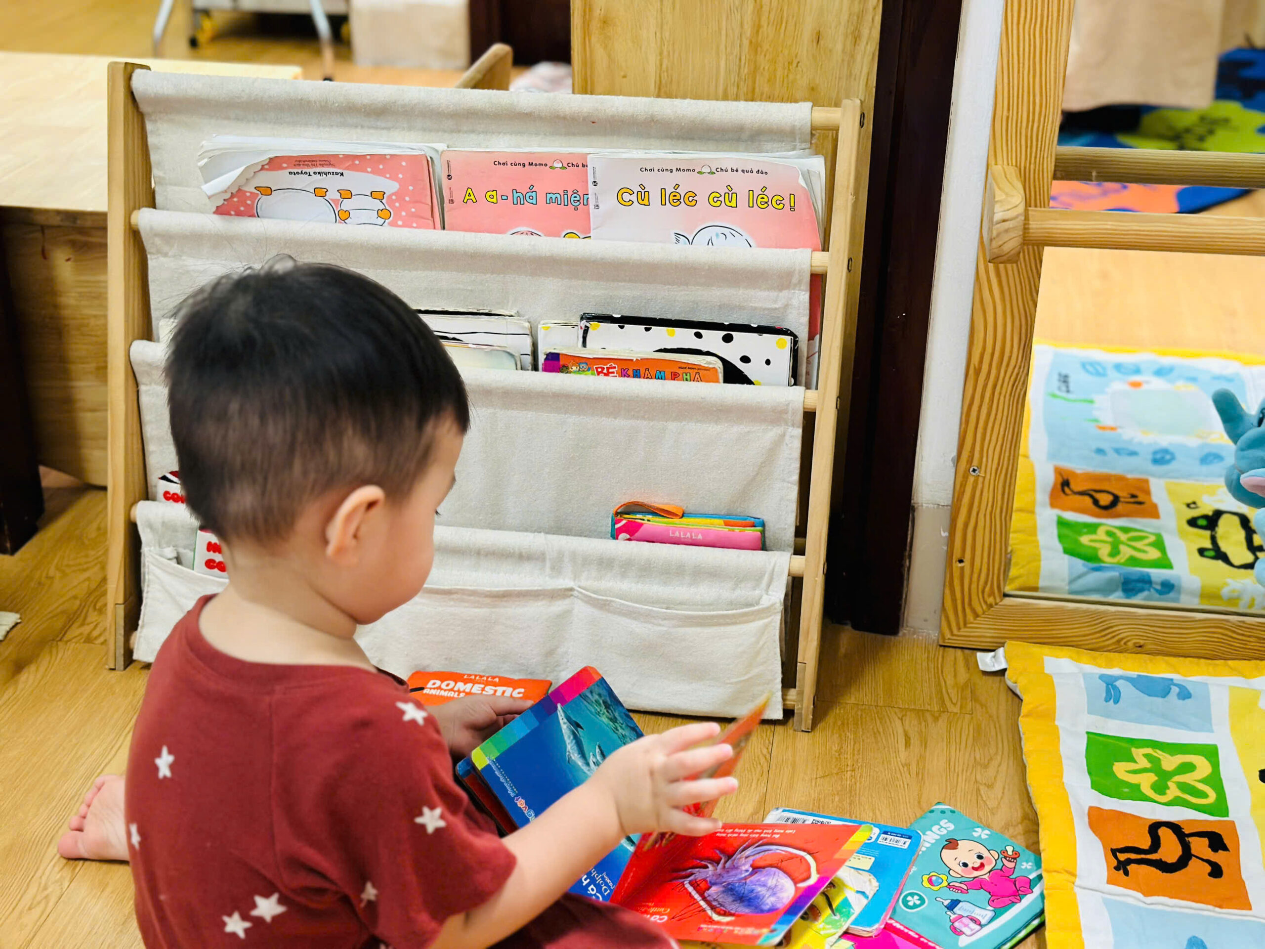 An toàn & Thân thiện: Sàn nhà êm ái, vật liệu tự nhiên (gỗ, vải, mây tre) thay thế cho nhựa, giúp bé cảm nhận thế giới qua xúc giác một cách chân thực nhất.