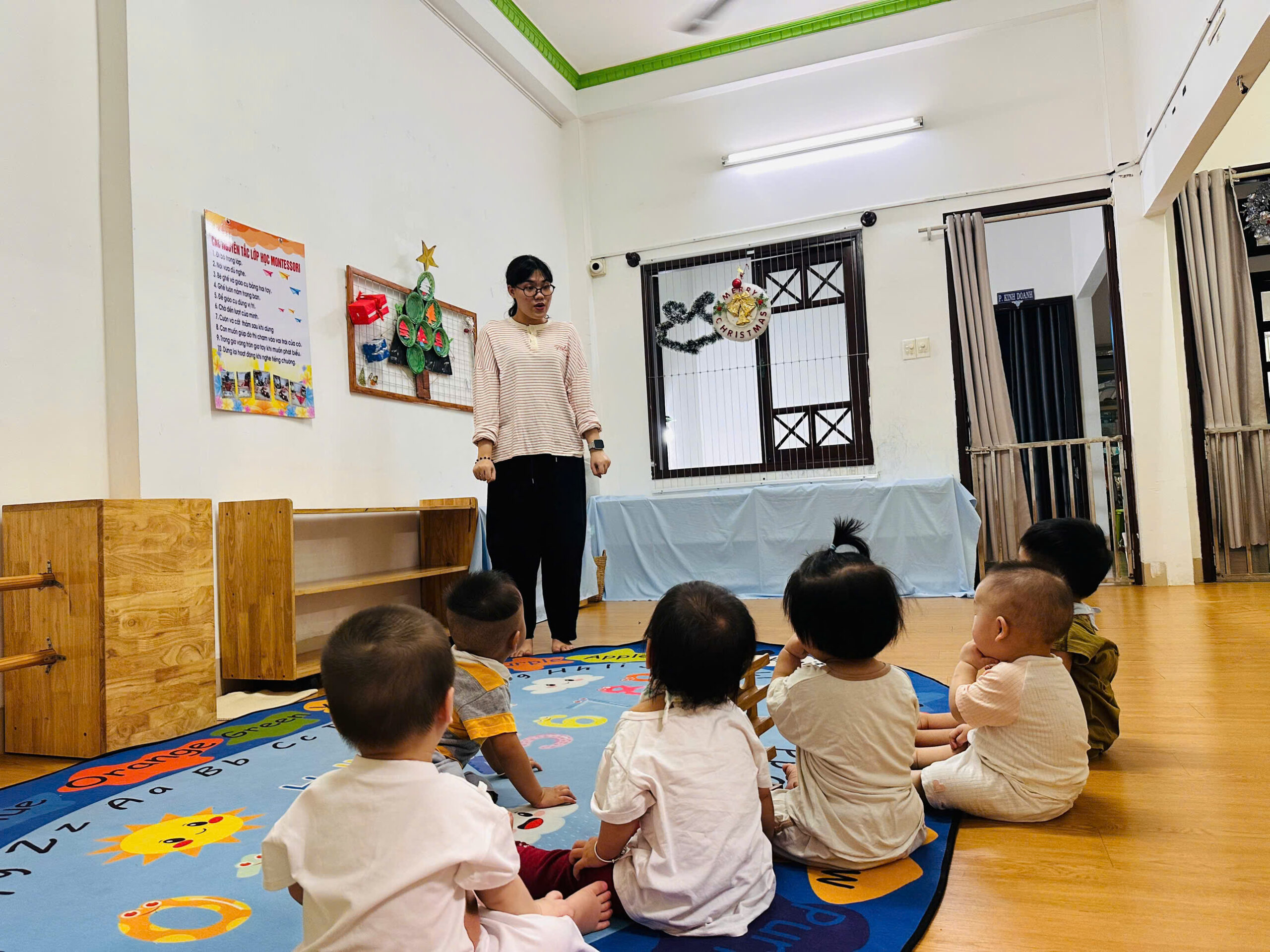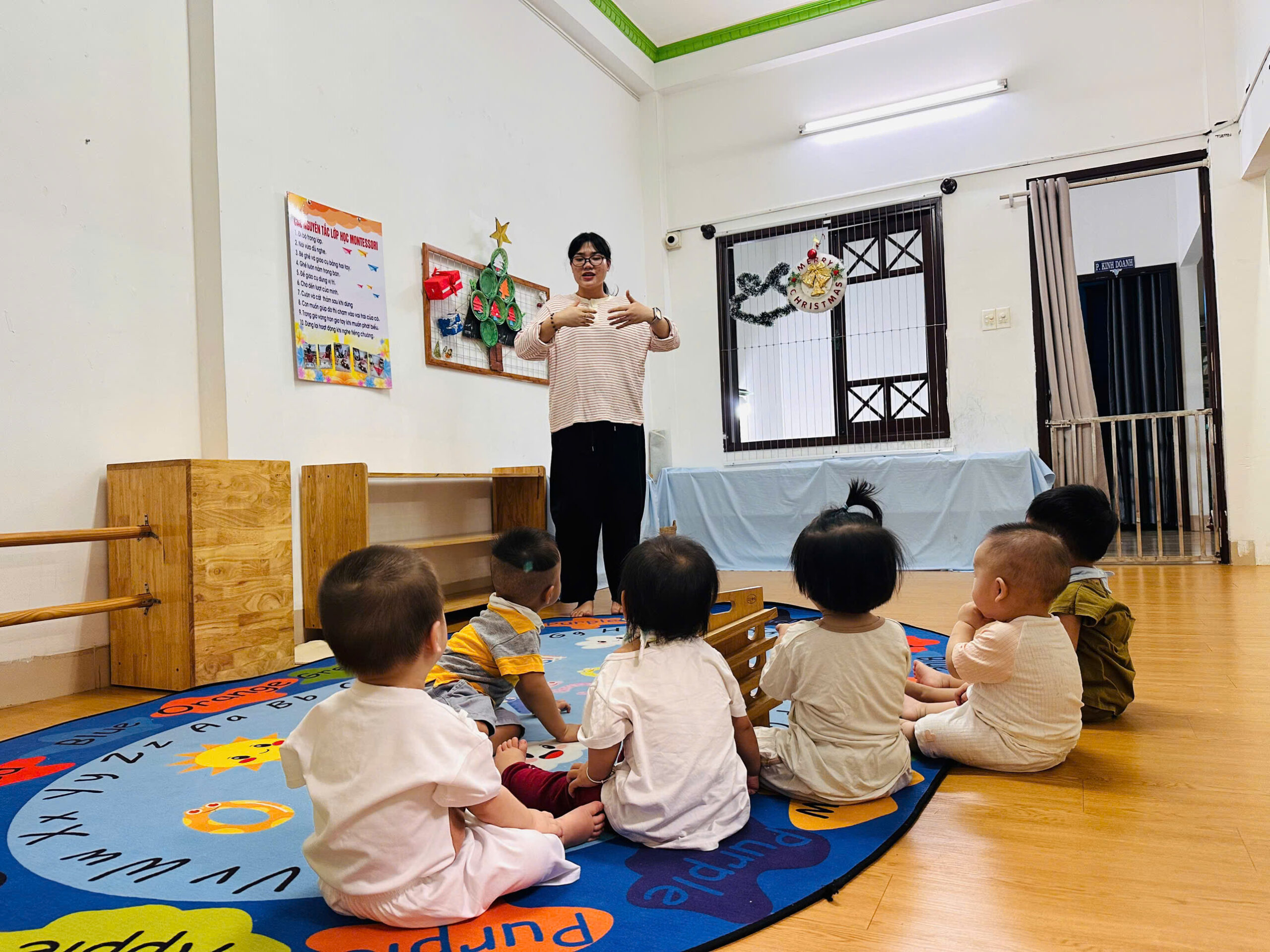 Ngôn ngữ thẩm thấu: Các cô giáo luôn giao tiếp, gọi tên cảm xúc và sự vật, đọc sách và hát ru, giúp bé “tắm” trong ngôn ngữ để bật ra những tiếng nói đầu đời.